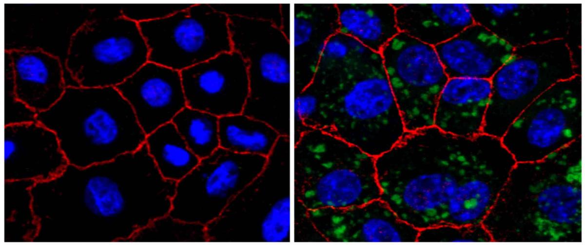 Cellules de l’épithélium pigmentaire rétinien avec le noyau des cellules (bleu), la membrane délimitant chaque cellule (rouge) et l’introduction des dépôts de dérivés du pigment visuel (vert) permettant de modéliser le vieillissement cellulaire. D’après Arnault et al., 2013.